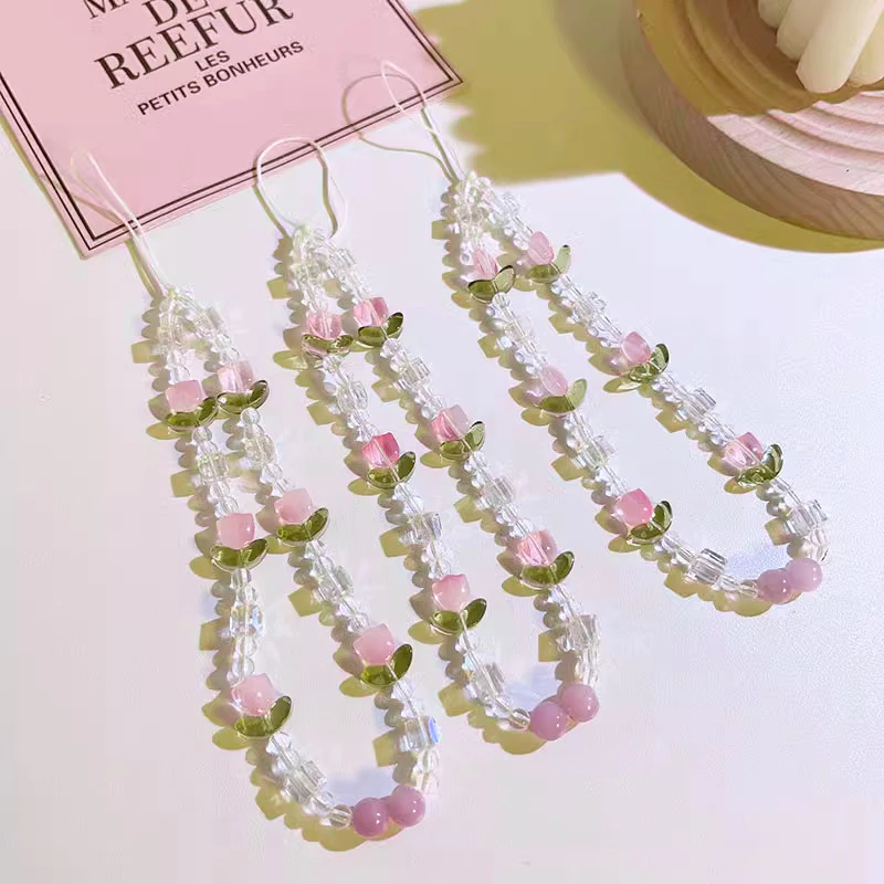 Ins โทรศัพท์เกาหลีแขวนโซ่เชือกเส้นเล็กน่ารักทิวลิปคริสตัลลูกปัดโทรศัพท์โซ่